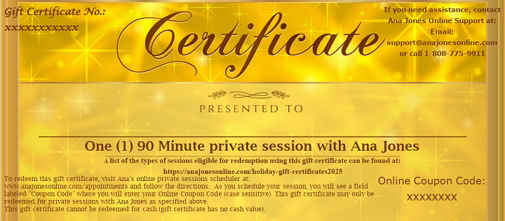These gift certificates are valid for Phone Sessions, Zoom sessions or In Person with Ana at her office in Sonoma, CA.
